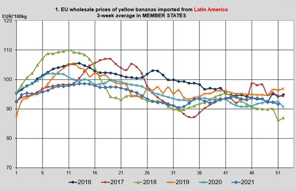 Nella prima settimana del 2022, i prezzi medi all'ingrosso delle banane provenienti dal Gruppo degli stati dell'Africa, dei Caraibi e del Pacifico (ACP) si sono attestati a 93 euro/100 kg in Francia, a 66 euro/100 kg nei Paesi Bassi e a 67 euro/100 kg in Spagna.