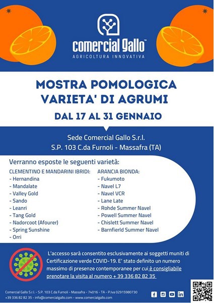 E' partita ieri, 17 gennaio 2022, la Mostra Pomologica degli agrumi, curata dalla Comercial Gallo. Un allestimento di 17 varietà, che durerà fino a lunedì 31 gennaio: nove le cultivar di clementino e mandarini ibridi e otto quelle di arancio biondo, esposte in un ambiente a temperatura controllata, nella sede della società sita a Massafra (Taranto).