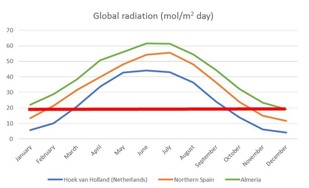 Questa scelta significa produrre in primavera e in autunno, poiché non è interessante farlo in estate poiché ci sono molti pomodori coltivati in pieno campo e i prezzi sono più bassi, ma neanche in inverno, perché la luce è inferiore alle 20 moli/mq al giorno. Così è ad Almería, dove infatti è possibile produrre in inverno, senza luce artificiale. Tuttavia, non è così nel nord della Spagna, dove per almeno 3 mesi si hanno livelli di radiazioni inferiori alle 20 moli. Se li confrontiamo con quelli dei Paesi Bassi ad esempio, ovviamente il periodo con livelli di luce più bassi, è ancora più lungo.