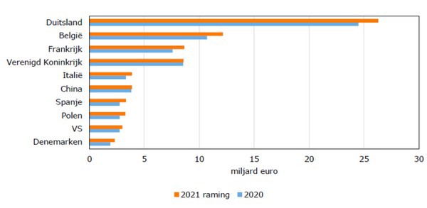 Come negli anni precedenti, nel 2021 la maggior parte delle esportazioni agricole è stata destinata ai Paesi limitrofi. Un quarto delle esportazioni totali stimate è andato alla Germania (26,3 miliardi di euro). Il Belgio è al secondo posto con il 12% (12,1 miliardi di euro). Seguono Francia e Regno Unito (rispettivamente all'8% o 8,6 miliardi di euro). Questi quattro Paesi limitrofi hanno rappresentato il 53% delle esportazioni agricole olandesi totali.