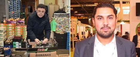 A sinistra: Il padre, Seref Aksoy, al mercato all'ingrosso nel 2018. A destra: Il figlio Mustafa durante il Fruit Attraction 2019.