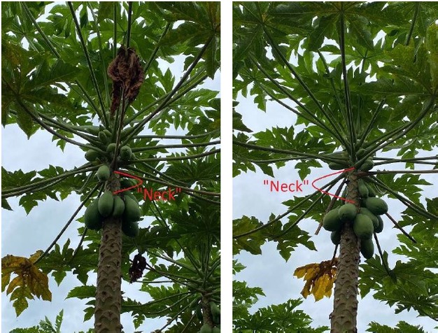 - sebbene gli alberi di papaya producano frutti continuamente, ci sono periodi con rese estremamente basse, chiamate localmente "collo", poiché c'è un gap tra il frutto pronto per la raccolta e gli altri che sono ancora alle prime fasi di crescita (vedi foto sotto che illustrano questo "collo"). In questa fase della produzione, il volume totale di un'azienda agricola diminuisce di oltre il 70%.