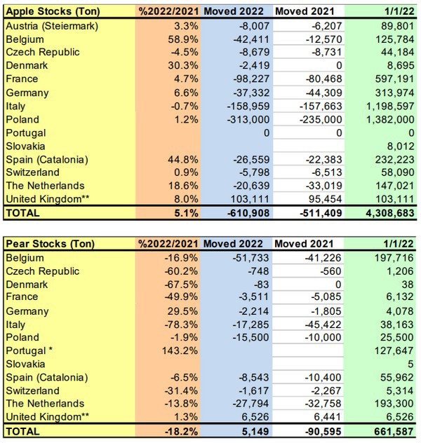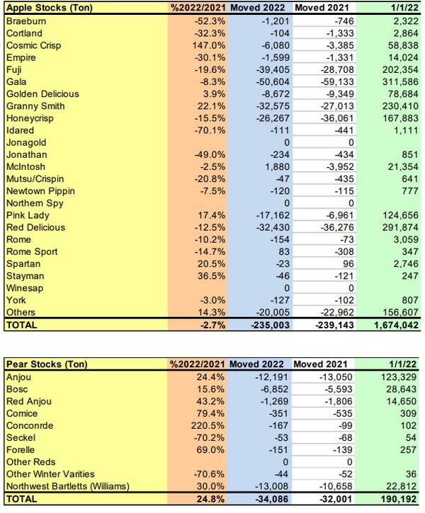 WAPA, l'associazione mondiale di pomacee, ha pubblicato i primi dati sulle scorte di mele e pere del 2022. Le cifre mostrano che in Europa gli stock di mele sono aumentate del 5,1% rispetto al 2021, raggiungendo 4.308.683 tonnellate al 1° gennaio 2022, mentre quelle di pere sono diminuite del 18,2% a 661.587 ton. Negli Stati Uniti, le scorte di mele al 1° gennaio 2022 erano di 1.674.042 tonnellate (-2,7% rispetto al 2021), mentre quelle di pere hanno raggiunto 190.192 ton (24,8% sopra il 2021).