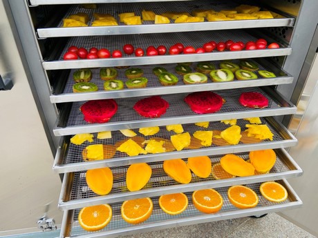 Frutta pronta per essere essiccata in una delle macchine a pompa di calore dell'azienda