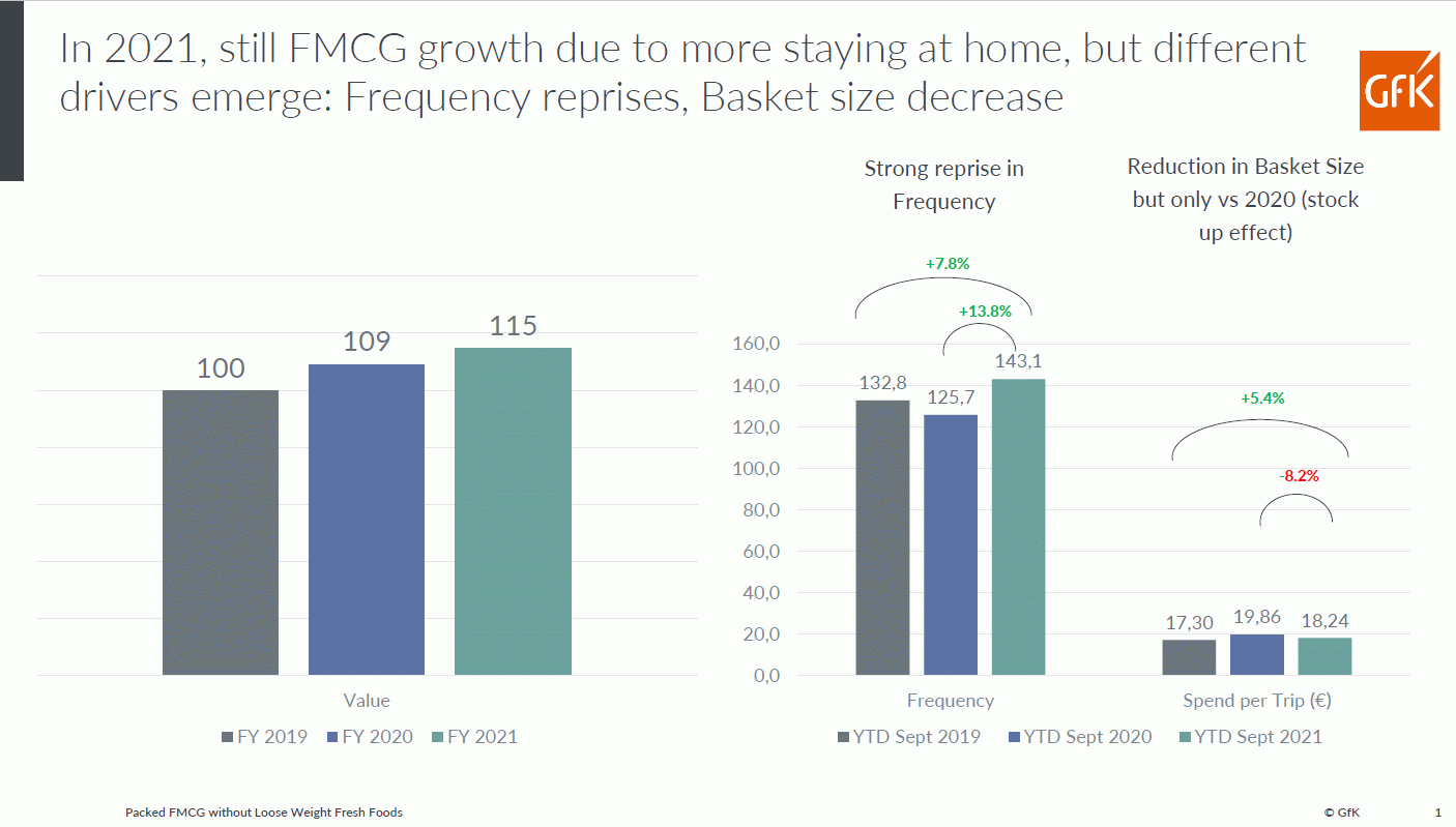 Viviamo quindi una fase di acquisti amplificati, nella misura del +15% a valore rispetto al 2019 (pre-Covid) se consideriamo tutti i canali, on e offline, moderni e tradizionali di qualsiasi tipo e tutti i prodotti, confezionati o a peso variabile. Cambiano però i driver dell'ulteriore crescita, rispetto a quanto avvenuto nel 2020. Aumenta infatti molto la frequenza di acquisto che raggiunge i 143 atti medi per famiglia: si torna quindi a fare la spesa in sicurezza, rispetto ad un 2020 che – in alcune fasi – aveva mostrato una strategia di riduzione della frequenza di visita dei negozi ed una strategia di accaparramento, con carrelli sempre più pieni e quindi scontrini molto più elevati del solito. La battuta di cassa nel 2021 rientra ma resta comunque su livelli superiori del 5,4% rispetto al pre-Covid.