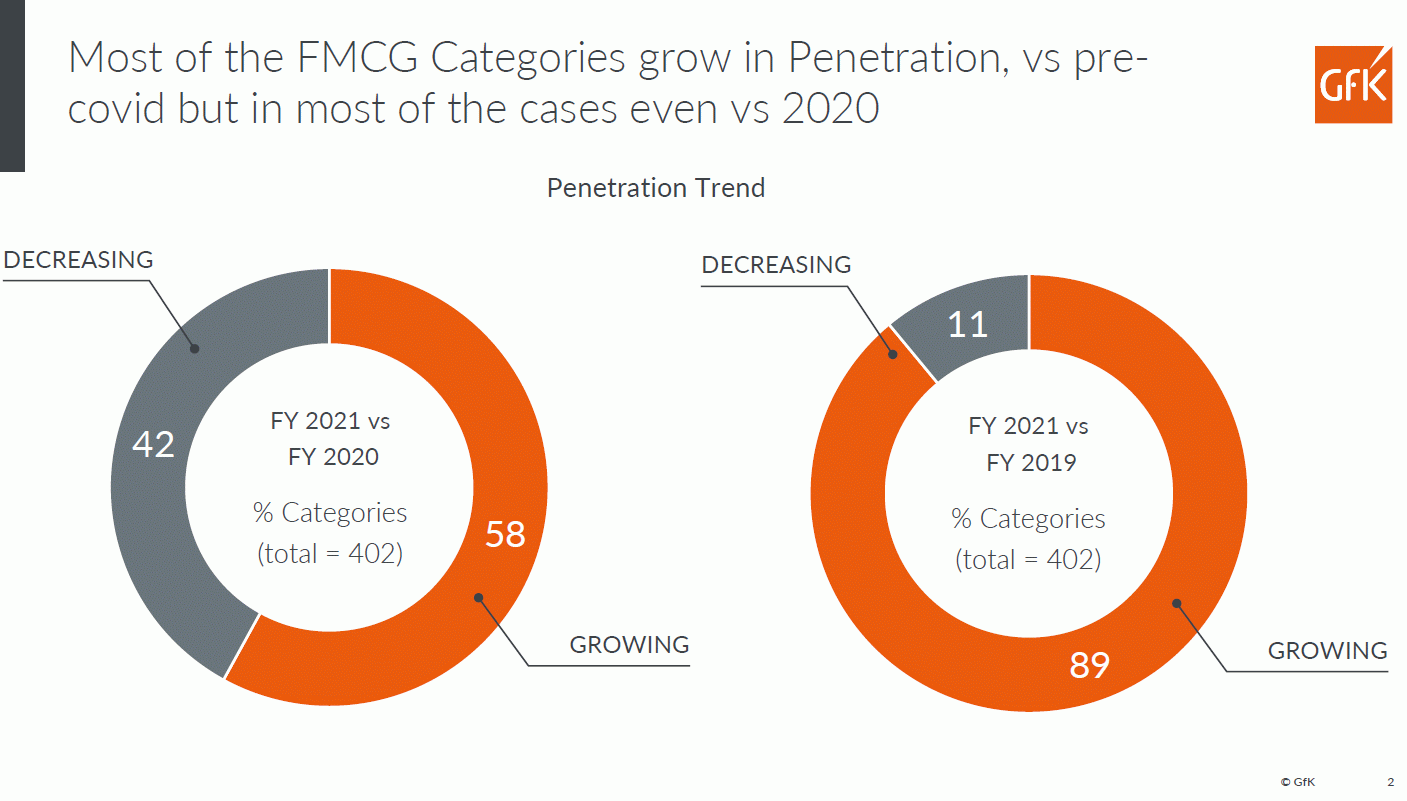 Gli acquisti per prodotti di largo consumo destinati a consumo domestico sono in continua crescita. Dopo un 2020 straordinariamente positivo per via delle restrizioni alla mobilità legate alla situazione pandemica, anche il 2021 è lontano da un ritorno alla normalità e addirittura mostra un'ulteriore crescita rispetto al 2020.