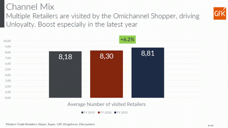 Nonostante le restrizioni alla mobilità, anche la diversificazione tra canali e insegne resta la regola per lo shopper italiano. La famiglia media frequenta quasi 9 diversi canali (compresi tutti i tipi di negozi tradizionali come fruttivendoli, macellerie, gastronomie, salumerie…) per approvvigionarsi di prodotti largo consumo nell'arco dell'anno, e anche questo dato è in crescita rispetto al 2019, anno pre-Covid.