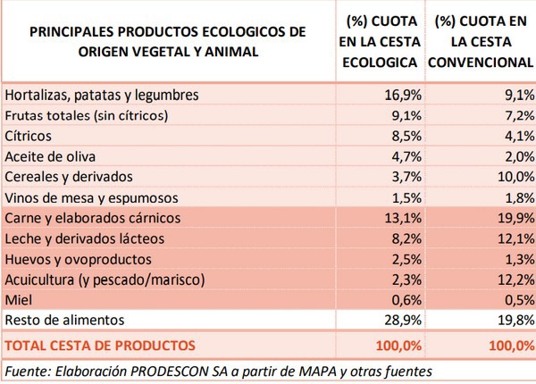 I prodotti vegetali biologici più consumati in Spagna sono stati la frutta fresca, con una quota del 15,5% del paniere biologico. Le verdure fresche si sono piazzate al secondo posto, con il 13,9%. A seguire pane, biscotti e dolci, che insieme rappresentano il 6,6% degli acquisti biologici, e olio e vino (4,4% e 2,2% rispettivamente), come si vede nella tabella sottostante.