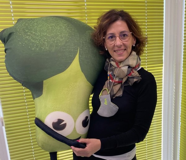 Sara Oliver con la mascotte dell'associazione +brócoli, Brocolín.