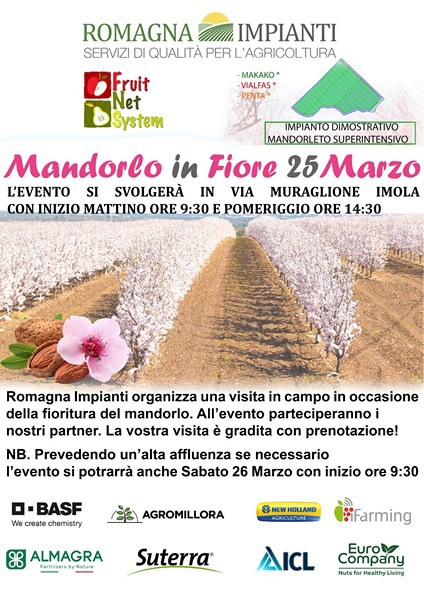 Romagna Impianti e Fruitnet System organizzano, per il 25 marzo 2022, una visita tecnica al mandorleto super intensivo. Vi saranno due sessioni fra cui scegliere, alle 9,30 e alle 14.30. L'impianto si trova in via Muraglione a Imola (Bologna).