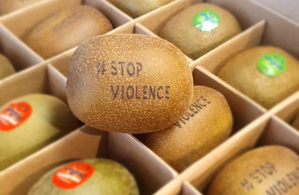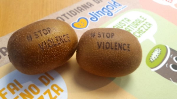 "Stop violence", 'stop alla violenza' è il messaggio che Jingold ha impresso al laser sui propri kiwi nelle confezioni da 7, 14 e 21 frutti, destinati alla vendita online.