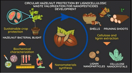 In un contesto di fattiva economia circolare, è stato sviluppato uno studio con l'obiettivo di valutare le biomasse lignocellulosiche ottenute dai residui di potatura e dai gusci delle nocciole come fonti rinnovabili per l'estrazione di cellulosa e di lignina; da questi due biopolimeri sono stati poi sintetizzati e caratterizzati nanocristalli di cellulosa e nanoparticelle di lignina e quindi gli stessi sono stati studiati rispetto alle loro proprietà antimicrobiche nei confronti dell'agente causale della necrosi batterica (Xac) del nocciolo, ed alla loro biocompatibilità con i tessuti vegetali di nocciolo.