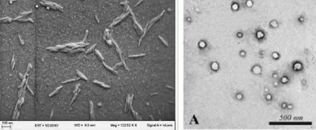 A sinistra: nanocristalli di cellulosa osservati al microscopio elettronico a scansione (SEM); a destra: nanoparticelle di lignina osservate al microscopio elettronico a trasmissione (TEM)