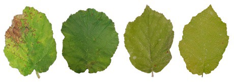 Sintomi da Xanthomonas arboricola pv. corylina (LMG688) registrati dopo 21 giorni dall'inoculazione artificiale (1 x 106 UFC/ml) su foglie di piante di nocciolo di 1 anno, cv. Tonda Gentile Romana (da sin a ds: Controllo + (nessun trattamento); Controllo – (Ossicloruro di rame 0.6% p/v); Nanocristalli di cellulosa, 1%; Nanoparticelle di lignina, 1%)