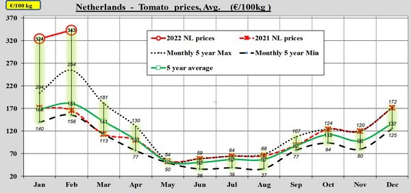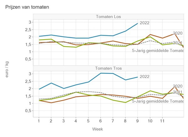 In Italia e nei Paesi Bassi il prezzo al chilogrammo è ancora più alto. Secondo le statistiche, l'Italia registra 2,20 euro, i Paesi Bassi addirittura 3,43 euro. Questo prezzo medio al chilogrammo risulta essere persino più alto di quello del 2021, che si era già rivelato un anno particolare per i pomodori. I prezzi record, in realtà, non sono motivo di celebrazione. La situazione per ogni coltivatore (buon contratto di gas o no, virus o no) varia molto e, in tutti i casi, le preoccupazioni sono grandi, in particolare a causa della guerra in Ucraina.