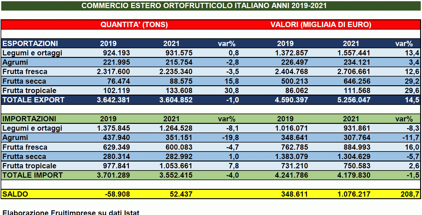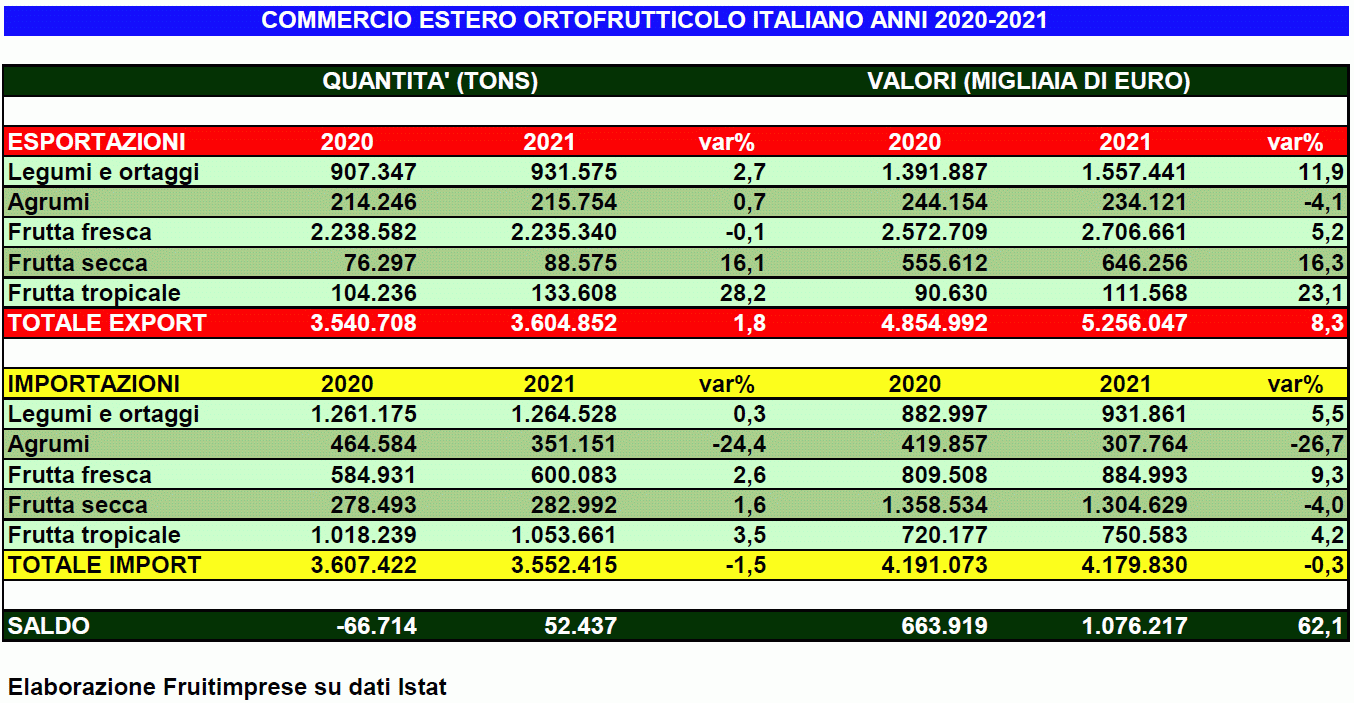 Il valore dell'export supera i 5,2 miliardi di euro, il valore dell'import si ferma a poco meno di 4,18 miliardi. Il saldo commerciale positivo anno su anno balza a oltre un miliardo di euro, con uno scatto del 62,1%. Lo rende noto Fruitimprese sulla base dei dati Istat.
