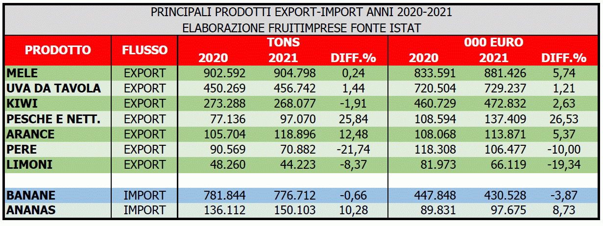Dopo un 2020 difficilissimo, si riprendono pesche e nettarine: 137,4 milioni di euro (+26,53%). Seguono arance (113,8 milioni di euro, +5,37%), pere (106,4 milioni di euro, -10%) e limoni (66 milioni di euro, -19,3%). Tra i prodotti più importati si confermano banane (430,5 milioni di euro, -3,87%) e ananas (97 milioni di euro, +8,7%).