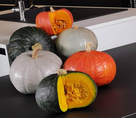 In foto, le tre zucche di successo di Levantia Seed: Reddy F1 (zucca rossa), Vanity (zucca grigia) e Dulcimaks (zucca verde)