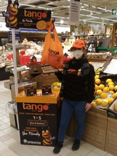 Grandi manifesti nei reparti della frutta di alcuni ipermercati, presentazioni e packaging personalizzati e differenziati, display nei mercati all'ingrosso, degustazioni nei supermercati di quartiere servite da hostess con il brand del marchio, decorazioni con l'immagine dell'ape sorridente ben visibile, lotterie, promozioni sui social media: per questa campagna, il marchio Tango Fruit ha moltiplicato la sua attività promozionale.