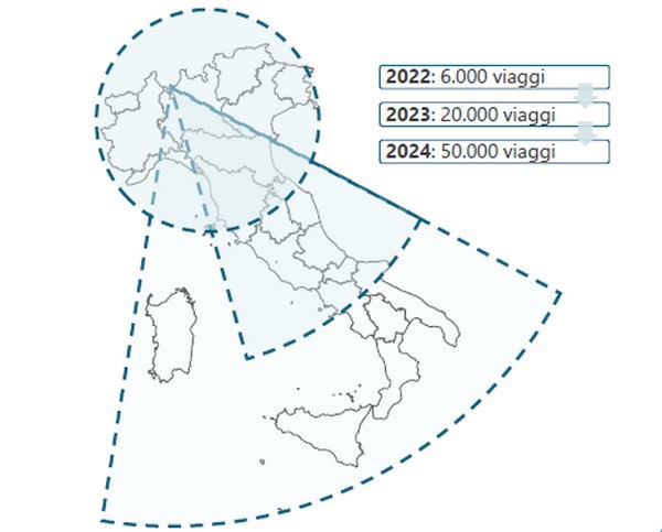 E' previsto un piano di sviluppo ambizioso: 6.000 viaggi nel 2022, 20.000 nel 2023 e 50.000 viaggi nel 2024. "Un ritmo di crescita sostenuto per coprire in pochi anni tutto il territorio nazionale".