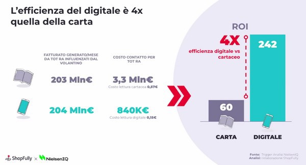 Ma è il tema dell'efficienza del digitale che sorprende maggiormente. "Parliamo di 4 volte quella della carta. Se andiamo a considerare il fatturato generato in un mese da un tot di responsabili d'acquisto influenzati dal volantino e li confrontiamo con i costi di contatto per tot responsabili d'acquisto, il rapporto è infatti 4x. La carta ha dei costi da sostenere, senza però che si aggiungano audience e fatturato. Inoltre, gli shopper usano sempre più canali digitali per scoprire offerte e promozioni".