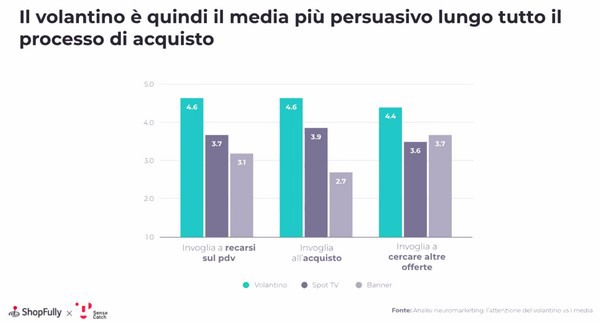 "Il volantino è una fonte di intrattenimento per gli shopper: il livello di coinvolgimento si mantiene elevato fino alle ultime 3 pagine. Inoltre, l'attenzione degli shopper sul volantino verte su insegna e informazioni aggiuntive, promozioni e offerte in primis, favorendo il ricordo dell'insegna stessa, ma anche la percezione dei valori. Il volantino è quindi il media più persuasivo lungo tutto il processo di acquisto: invoglia a recarsi sul punto vendita, invoglia all'acquisto e invoglia a cercare altre offerte", ha spiegato Songa.
