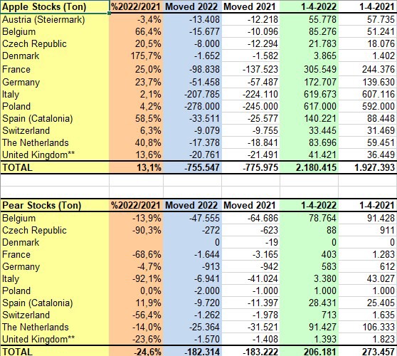 WAPA, l'Associazione mondiale delle pomacee, ha pubblicato i dati sulle scorte di mele e pere al 1° aprile 2022. I dati mostrano che in Europa le scorte di mele sono aumentate, mentre gli stock di pere sono diminuiti.