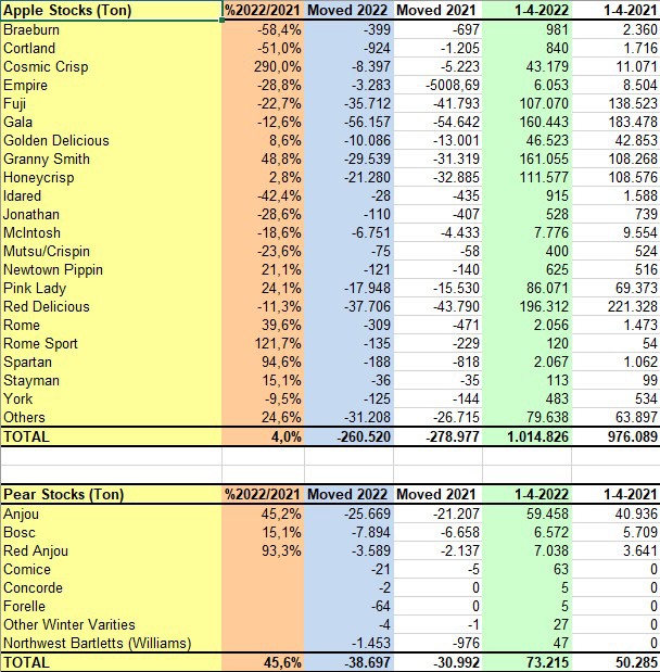 Negli Stati Uniti, sia le scorte di mele che quelle di pere, al 1° aprile 2022, hanno registrato incrementi.