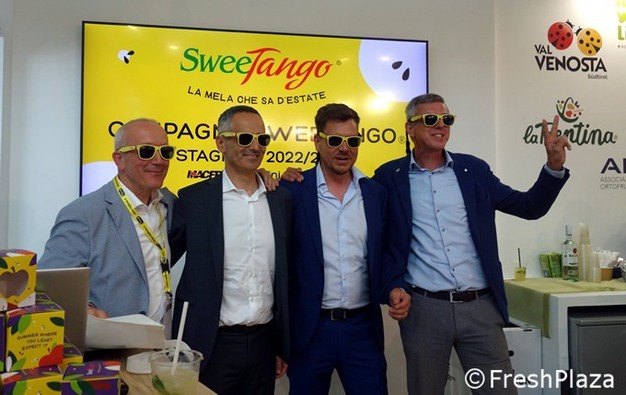 In foto, con un look estivo: Paolo Gerevini, direttore generale dei Consorzi Melinda e La Trentina, Walter Pardatscher, direttore di VOG, Jurg Burri, coordinatore dello STEG – SweeTango Europe Group e Martin Pinzger, direttore generale di VIP, l’Associazione dei produttori ortofrutticoli della Val Venosta