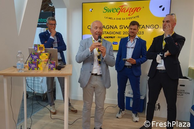 Paolo Gerevini, direttore generale dei Consorzi Melinda e La Trentina, ha introdotto la presentazione del progetto di produzione e produzione della Sweetango in Italia, ma che vede impegnati anche altri Paesi in Europa.