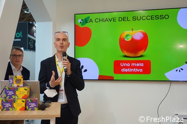 La presentazione ha avuto luogo presso lo stand collettivo di Assomela a Macfrut, in un clima festoso ed estivo, proprio come questa mela.