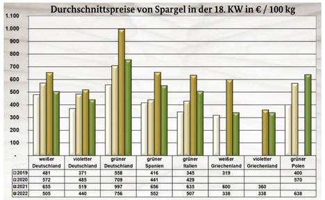 Per quanto riguarda gli asparagi bianchi e viola, oltre che verdi, sui mercati tedeschi l'attenzione è andata ovviamente alle forniture domestiche. Le importazioni da Spagna, Italia, Grecia, Paesi Bassi e Belgio non sono andate oltre lo status supplementare. Secondo il rapporto BLE, le consegne nazionali sono nuovamente aumentate e, in generale, hanno superato le vendite. In diverse situazioni, le eccedenze della settimana precedente sono state gestite.