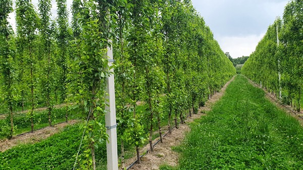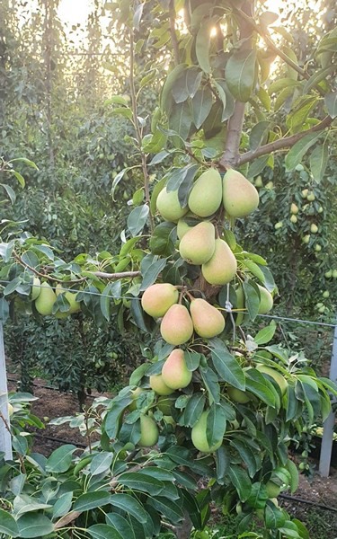 "La pera Coscia viene raccolta a luglio, mentre l'Abate a partire da fine agosto. I nostri pereti verticali sono stati realizzati con un sesto d'impianto di 0,65x3,50 m. Al momento hanno raggiunto un'altezza di oltre 3 metri. Su ogni pianta crescono 120-130 frutti di un peso medio di 100 g. La raccolta, come anche la potatura, viene effettuata con un carro sollevatore, capace di portare fino a 4 persone, in modo da velocizzare le operazioni. Sono molto soddisfatto dei risultati ottenuti e di come si presenta il prodotto. Infatti, le piante poste in verticale permettono di intercettare al meglio la luce e di ottenere frutti più attraenti dal punto di vista della colorazione".