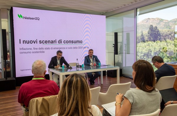 Al tavolo dei relatori: Romolo De Camillis (retailer director NielsenIQ Italia) e Luca De Nard (amministratore delegato NielsenIQ Italia)