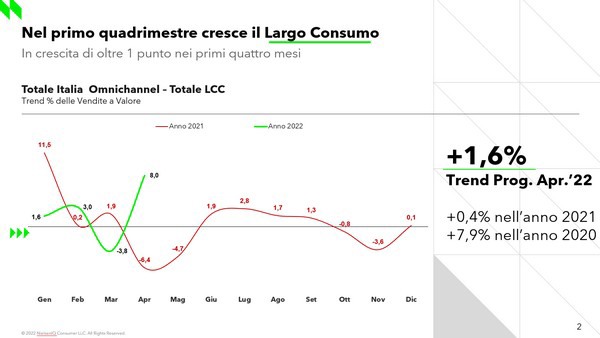 Il quadro che emerge nel primo quadrimestre del 2022 sul 2021 mostra un andamento diverso rispetto a quelle che erano le prospettive di mercato. Infatti, i dati del primo trimestre relativi a LCC hanno registrato uno stabile declino fino al mese di marzo. Tuttavia, grazie anche al contributo positivo della Pasqua (aprile +8%) si attesta una crescita di oltre 1 punto nei primi quattro mesi del 2022.