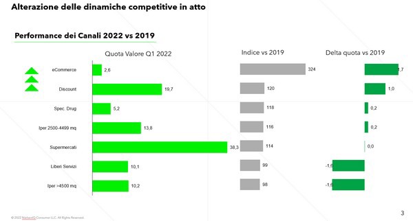 L'alterazione delle dinamiche competitive in atto, differenzia la performance dei canali di vendita. Stando ai dati del 2019 di NielsenIQ rispetto all'anno corrente, l'e-commerce nel Q1 ha un valore di 2,6 diversamente dalla quota (0,9) registrata nel 2019, mentre i discount raggiungono attualmente quasi il 20% del valore guadagnando 1 punto rispetto al 2019. Resta solida la categoria dei supermercati che tra il 2019 e il 2022 non ha riscontrato variazioni e registra, oggi, un valore del 38,3%.