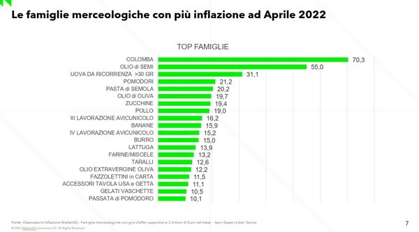 Nell'ambito del largo consumo confezionato (LCC) l'inflazione al momento è attorno al 4,8%; le previsioni di NielsenIQ stimano che potrebbe arrivare fino al 6% entro l'anno, a causa dell'aumento dei prezzi delle materie prime, dei costi di trasporto e dell'energia. Da un lato, le scelte di acquisto da parte dei consumatori compensano l'aumento dei prezzi, con un incremento reale di circa il 2%.