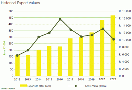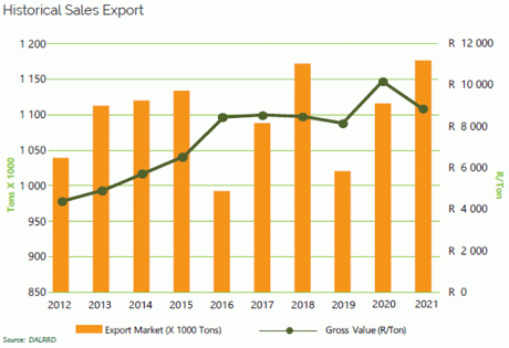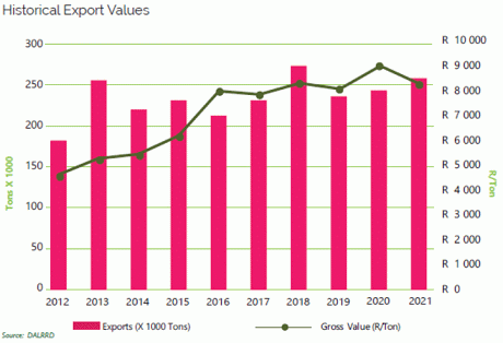 Serie storica 2012-2021 export pompelmi Sudafrica