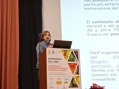 "Tra gli alimenti funzionali - ha detto la docente universitaria - possiamo citare il pomodoro, di cui esistono varie tipologie e che per comodità classificheremo in: pomodorini a grappolo, pomodori insalatari e pomodori da salsa. Tra i pomodori a grappolo, il ciliegino è molto utilizzato per il consumo fresco. I frutti di pomodoro sono ricchi di zuccheri, vitamine (A, C ed E), minerali e antiossidanti (carotenoidi e composti fenolici). Inoltre, i pomodori ciliegini sono un'ottima fonte di fibre alimentari a basso contenuto di sodio e di grassi saturi. La frazione lipofila è molto importante per proprietà nutrizionali e organolettiche del pomodoro e per l'azione antiossidante e attività protettive. Questa frazione, infatti, comprende carotenoidi lipofili, tocoferoli e lipidi insaturi. In Sicilia, una ampia produzione ha reso possibile studiare le differenze dei componenti lipofili dei pomodori relative alle aree di coltivazione".