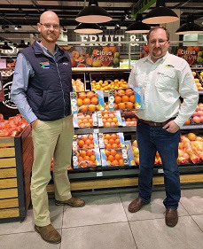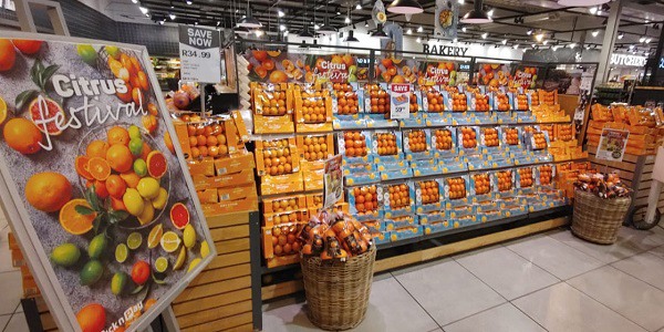 Confezioni blu di mandarini esposte insieme agli altri agrumi di Pick n Pay presso la filiale di Constantia, Città del Capo (foto fornita da Pick n Pay)