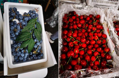 Mirtilli (a sinistra) e ciliegie dello Shandong (a destra)