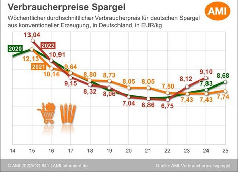La stagione degli asparagi 2022 è stata impegnativa per i coltivatori. Nonostante le buone condizioni climatiche, il numero sufficiente di raccoglitori e le migliori qualità di asparagi, all'inizio della stagione i prezzi sono scesi bruscamente a causa della domanda limitata e sono riusciti a malapena a riprendersi alla fine della stagione. Per la maggior parte, e per molte settimane, i prezzi alla produzione sono stati appena sufficienti o inadeguati, soprattutto nei settori della vendita al dettaglio e all'ingrosso. Solo nei settori della ristorazione e della commercializzazione diretta le aziende agricole sono riuscite a ottenere prezzi soddisfacenti.