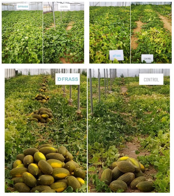 Trial di oFrass sui meloni: confronto colturale con e senza la soluzione della Tebrio il 25 aprile (foto in alto a sinistra), dopo la prima raccolta (foto in alto a destra) e dopo la seconda raccolta (foto in basso).