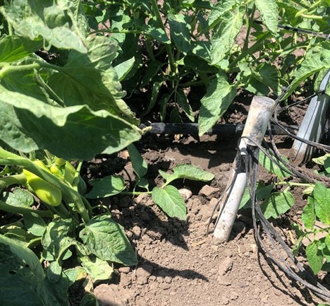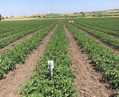 Sensore IoT in un campo di pomodoro da industria