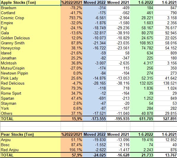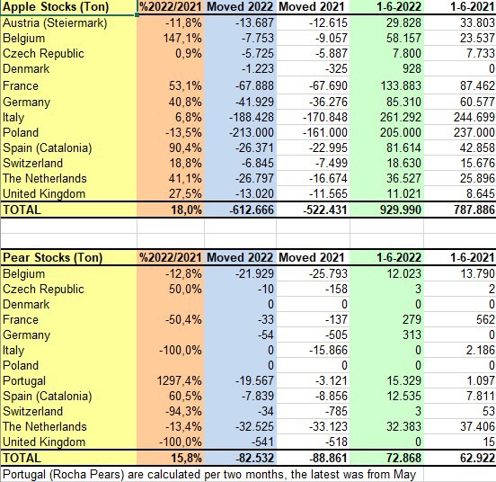 WAPA, l'Associazione mondiale pomacee, ha pubblicato i dati sulle scorte di mele e pere al 1° giugno 2022. I dati mostrano che, in Europa, le scorte di mele sono aumentate del 18% rispetto alla stessa data del 2021, raggiungendo 929.990 tonnellate, mentre gli stock di pere sono aumentate del 15,8% attestandosi a 72.868 ton.