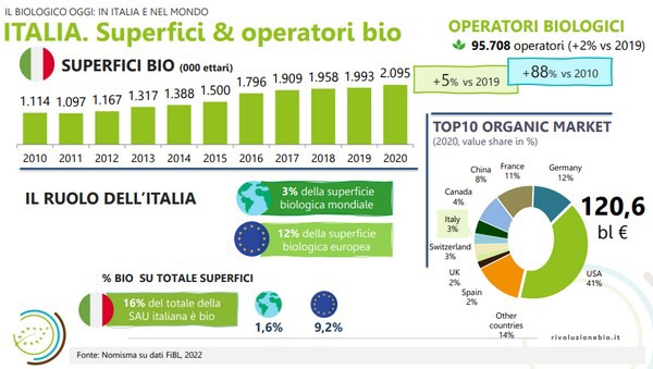 Le anticipazioni confermano il ruolo leader dell'Italia nel settore e rilevano una flessione dei consumi bio dopo la crescita consistente legata alla pandemia. Il nostro Paese, con oltre 2 milioni di ettari, è leader del settore biologico: vanta la più alta percentuale di superfici bio sul totale, il 16%, contro il 10% della Germania e della Spagna, e il 9% della Francia, e detiene il primato in Ue per numero di produttori biologici.