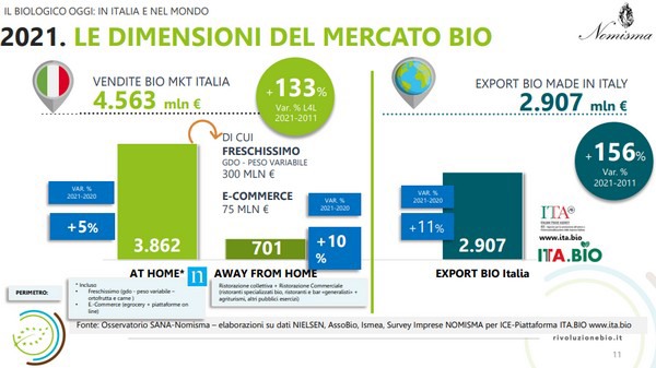Dal 2008 ad oggi il mercato domestico del biologico è cresciuto del +233% con una più che positiva performance dell’export bio: nel 2021 le vendite di prodotti agroalimentari italiani bio sui mercati internazionali hanno raggiunto 2,9 miliardi di euro (+671% rispetto al 2008).