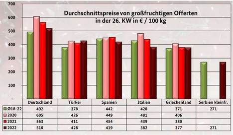 In generale, le proprietà organolettiche sono state abbastanza convincenti. Tuttavia, il clima estivo non ha necessariamente comportato un maggiore accesso da parte dei clienti. Invece, la maggiore disponibilità spesso ha costretto i retailer a ridurre le loro precedenti richieste. I frutti grandi - oltre i 30 mm - non sono stati completamente esclusi dalle promozioni, ma ovviamente le riduzioni hanno interessato soprattutto i calibri più piccoli.
