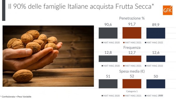 "La frutta secca è una categoria che in termini di penetrazione, frequenza e spesa media è importante, per il punto vendita. Mediamente una famiglia italiana spende 50 euro per frutta secca, confezionata o a peso variabile. Nell'ultimo anno, però, questa categoria non ha mostrato segnali di crescita, che sono più evidenti invece l'anno scorso, in particolare per penetrazione e spesa media. Dopo due anni molto positivi, ora si registra una normalizzazione o una contrazione di mercati, per via dei fenomeni inflattivi".