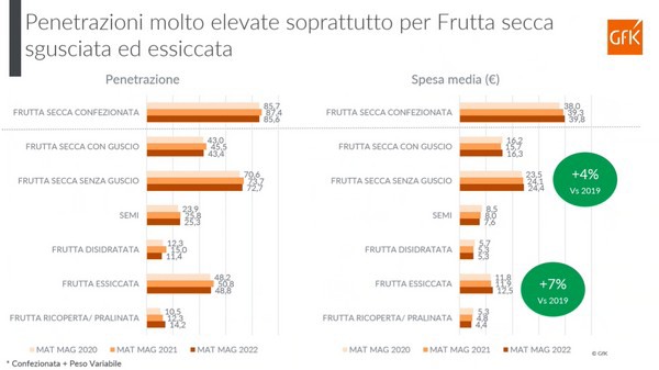 Pellizzoni ha sottolineato che in termini di trend, si segnala la penetrazione molto elevata soprattutto per frutta secca sgusciata ed essiccata. "Il prodotto senza guscio mostra una penetrazione del 73%, amplificata rispetto a due anni fa. Si tratta di un numero altissimo e vuol dire che 3 famiglie su 4 acquistano questo segmento". Trend positivo anche sulla frutta essiccata. "C'è una contrazione di penetrazione rispetto allo scorso anno, ma restiamo su livelli più alti rispetto a due anni fa".
